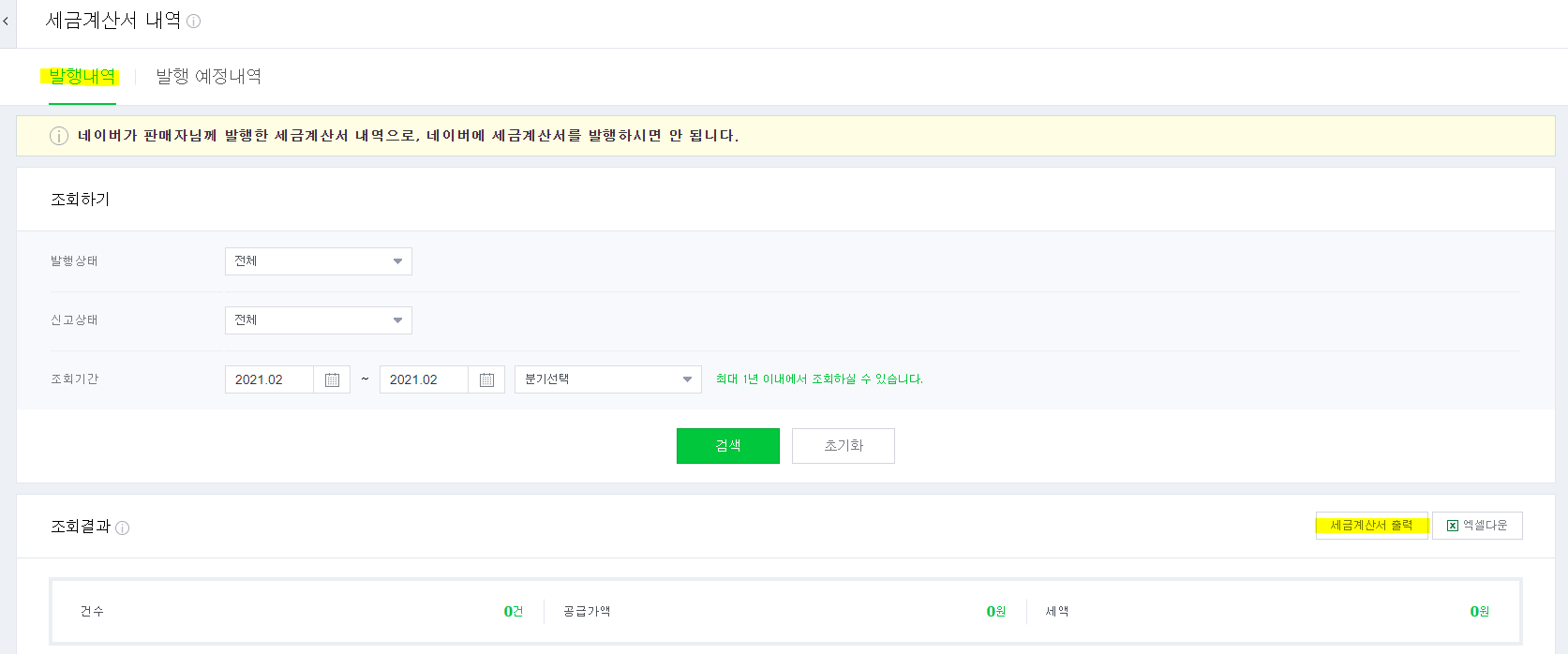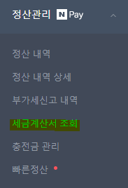 네이버 스마트 스토어 판매자 센터 => 정산관리 => 세금계산서 조회=> 세금계산서 내역